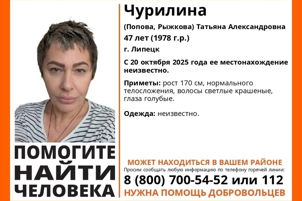 Поисковый отряд «ЛизаАлерт» объявил о пропаже 47-летней Татьяны Александровны Чурилиной (также известной под фамилиями Попова и Рыжкова), жительницы города Липецка. С момента исчезновения, которое произошло 20 октября 2025 года, ее местонахождение остается неизвестным.