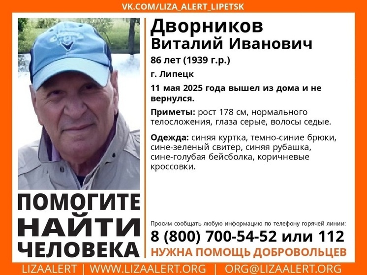 В Липецке разыскивают 86-летнего Виталия Дворникова. Мужчина ушел в неизвестном направлении 11 мая. С тех пор родные не могут с ним связаться.