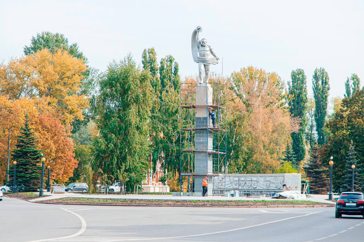 На площади Революции подрядчик восстановил бетонный постамент для фигуры человека и обновил тротуарную плитку вокруг памятника. Также проведена отсыпка чернозёмом и подготовка газона. Специалисты приступили к облицовке постамента гранитом, завершение работ запланировано на октябрь.